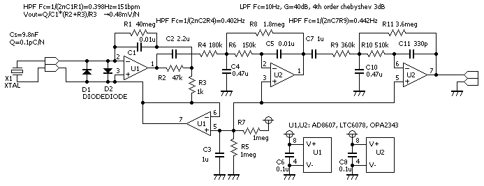 これは、チャージアンプ回路である。入力が圧電素子。それが変形すると電荷が発生するので、初段で電荷を電圧に変換する。二段目、三段目はバンドパスフィルタ。主に60Hzの誘導ノイズをカットするように設計されている。チャージアンプ、各段のBPFはゲインを持っている。残りの一つは中点電位のバッファである。