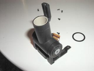 ![]() | 首ユニットに、首上下モータを差し込みます。写真でいうと、下の水平円柱の右に白いギアが見えています。これが問題としていたギアです。写真で上向きに立っている首の上に頭蓋骨を付けます。 |