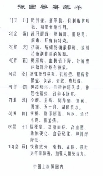 | 豫園のお茶売りコーナーでもらった効能書き | |
