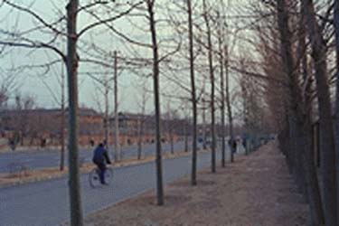 私が短期留学で滞在した北京外国語学院(現在は北京外国語大学)付近の通りです。たぶん近所の友誼賓館へ買い物に行く時に撮ったものだと思います。季節柄、樹木に葉っぱはなく、見るからに寒々としていますが、晴れている日なら歩いているとかなり体も温まります。