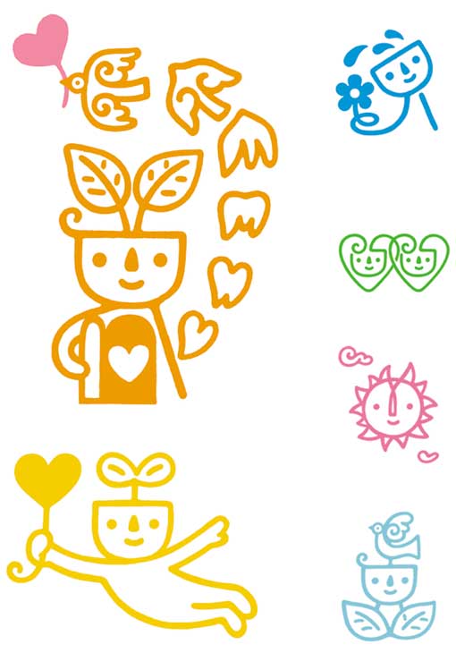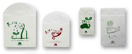 ポテト袋 電話代袋 ナプキン モスバーガーのパッケージに描かれているイラストは 自然からさまざまな恵みを与えてもらうことにより心も体も 満たされている人々を表現しています。 モスの新鮮な素材を生かした商品も 自然の恵みの一つと考えシンボリックにキャラクター化しました。 ※現在は使用されておりません。 |