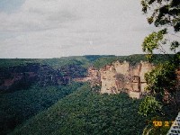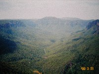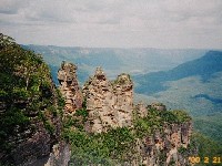 ハーバーブリッジを渡りしばらく走ると,もうシドニーの喧騒はなくなり,だだっ広い平野に変わっていきました。確かにブルーマウンテンは遠かった。車で二時間半はかかったでしょうか。まず,広大な景色が見えるレストランで昼食をとった後,いくつかのビューポイントへ連れて行ってもらいました。深い緑の大地が広がる台状の大地で,むき出した山肌にはくっきりと地層が見て取れます。アメリカのグランドキャニオンから見れば比べ物にならない(?)そうですが,やはり日本では見られないような大規模な景色でした。ブルーマウンテンというとコーヒーが思い浮かびますが,それはジャマイカのコーヒー生産地帯の山脈で何の関係もなく,名前の由来はがユーカリの木が発する油の蒸気で空気が青く見えるからだそうです。確かに遠くの山が青く霞んで見えていました。
