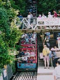 有名なスリーシスターズがある場所には,観光バスがとまり,多くの観光客がいました。鳥たちが美しい声で鳴いていたのが印象に残っています。ここにはスカイウェイというゴンドラと,シーニックレイルウェイというトロッコ列車があります。私達はトロッコ列車を選びました。このトロッコ列車はもともと,渓谷の下で採れた石炭を運び上げるために造られたものだそうです。傾斜がすごく,止まっている列車に乗り込んで席に座るだけで下に落ちそうな感じがします。また,シートがつるつる滑るんです。ちなみに世界一急なトロッコ列車としてギネスブックに載っているそうです。ちょっとしたジェットコースターのようですが,のっている時間は一瞬です。違う場所から見た時に,ちょうどこの列車のレールが,滑り台のように渓谷に突き出しているのが見えました。スリーシスターズをよく見ると,一番左側の岩には小さな橋がかかっていて渡れるようになっていて,何人かの人がいるのが見えました。ちょっと行ってみたい気がしたんだけど,ここはあんまりわがままを言わずに我慢でした。