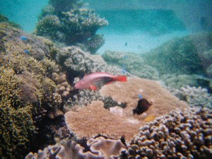 海にはネットが張られてあって,その外側に小さいサメがいるのが見えました。大きいサメとか出てきたりはしないのかなあ。他にもたくさんの魚たちが泳いでいました。さすがにサンゴの海でこんな海の真ん中なのにすごく浅くて,下手するとフィンがサンゴを傷付けてしまいそう。ただ,サンゴの色があまり鮮やかではなく,茶色や白っぽかったのが残念でした。やはり,私達が海を汚しているからなんでしょうか。