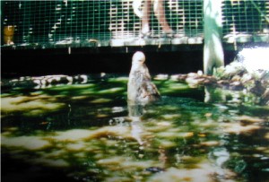 グリーン島に到着。この島に泊まるお客さんもいるようでした。グリーン島の周りはそんなにサンゴとかはありませんでした。みんなも泳いでいるよりはパラソルを広げてのんびりしている様子。海の探検はアウターリーフにとっておいて,島を探検することにしました。島には「Marineland Melanesia」という水族館があり,クロコダイルや海がめなどがいました。でも,クロコダイル達は狭い檻の中で眠っていて全然動かない。にごった水たまりがちょっとくさい。でも,ショーではこのクロコダイルが動いた!木の棒から鶏をつるし,クロコがいる水面をたたくとそろーっとえさに近づき,ちょっと体が浮いてきたと思ったらえさめがけてジャンプ!えさをつかんだ後は,すごい音がして重い体が水の中に落ちたのでした。うーん,迫力。