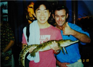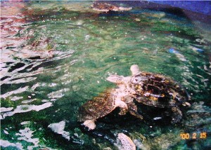 他にも,小さい子供のクロコを持たせてもらえたりしたのだけど,私は遠慮。おなかとか結構やわらかいそうです。でも,触った後は手がくさかったらしい。子供でもかみつかれたらやっぱり大変なので,ちゃんと口は縛ってあります。海がめたちは,えさをやるとお互い上に乗ったりしてすごい争奪戦を見せてくれました。飢えているのか,単にいやしいのか・・・。