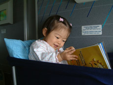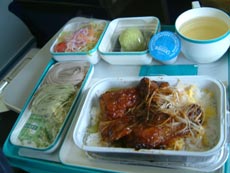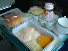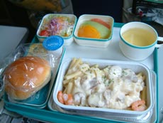 2席の所にHIYOを抱っこしてEIKIと並んで座っているので狭くて,空席があればEIKIに移ってもらおうと思ったのだけど満席。やっぱり混んでいます。ちょうど反対の窓側の席にも同じくらいの子供連れの親子が座っていました。 それでもHIYOは出発してしばらくは機嫌も悪くなく順調。バシネットを付けてもらうと,自分から乗りたがって,そこに座って雑誌をめくってしばらく遊んでいました。ガルーダではどんなグッズをくれるのかなと楽しみにしていたのに,くれたのはA4大の磁石のシートにちょうちょや花のマグネットを付けて遊ぶおもちゃだけ。やっぱり日系でないと充実してないのかな。 お昼になって,まずはHIYOのベビーミールがやってきました。じゃがいもとかぼちゃと鮭のパテと,パン,プリン,ジュース。お味はまずまずだったけど,HIYOはプリン以外それほど食べませんでした。 大人の機内食はチキンかシーフードかと聞かれたので,私はシーフードにするとパスタでした。EIKIはチキンで焼き鳥丼みたいな感じ。これってチキンかシーフードかって言うより,パスタかライスかって聞いて欲しい...。EIKIの方がおいしそう。普通はメインだけが違ってあとは同じだったりするのに,フルーツと和菓子,パンとそばと他の物まで違いました。 |
