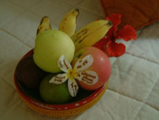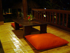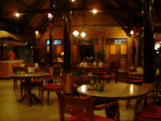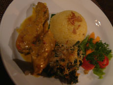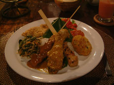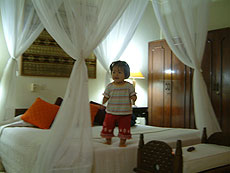 荷物を置いて晩ご飯を食べようと外に出ました。今日はアルマ・リゾート内にあるレストランで食事をしようと思い,とりあえずレセプションの前にあったレストランに行ってみました。するとそこはココカン・クラブで「高級」タイ料理レストランと言われるだけあってお値段も高め。それにインドネシアに来てタイ料理もなあと思っていると,私達の考えていることが分かったのかレストランの人が,「インドネシア料理ならカフェ・アルマで食べられるよ。レセプションに行きなさい。」と言います。 そう言えばカフェ・アルマの方はイタリア料理とインドネシア料理のお店になっていたなと思ったのだけど,何故レセプションに?するとレストランの人がすぐ傍のレセプションにいた男の人に何やら伝えています。そして,「車に乗ってください。」と運転手がやってきました。え,車で行くような所にあるの?と訳の分からないまま車に乗り込むと,車はいったん門を出て外の道を走り,アルマ・リゾートの敷地の周囲を走るようにしてカフェ・アルマに着きました。 運転手さんは,「食事が終わったら電話して。」と言いましたが,EIKIが「歩いて帰れる。」と言うと,「暗いし道が分からないでしょう。」と笑い,「まあ迎えが必要だったら電話して。」と言われました。 カフェ・アルマには誰もお客さんが入っていませんでした。7時半という時間帯は,ウブドで行われるレゴンダンスなどのショーが始まる時間なので,皆食事などしていないのかもしれません。もっと遅くに食べるのかな? バリにはテーブル席の他に,日本人には嬉しい座敷があって,私達もそこに座りました。HIYOも座敷をウロウロ出来て嬉しそう。そしてバリではどのレストランでもまずピーナッツが出てきます。ちょっと小粒なのだけど,これがおいしい!HIYOもこれが気に入って器用につまんでパクパクと口に頬張ります。硬いのにちゃんと食べれるのかな?と思っていたら,やはり口の中に溜め込んでいて,お茶を飲んだら詰って咽ていました(ーー;) 私はナシ・チャンプル,EIKIはカレー・アヤム(チキンカレー)を注文。「Nasi Campur」という綴りに,「キャンパー?」とか言っていたのだけど,「チャンプル」と言われて,沖縄料理と一緒だと驚きました。もとはここから来ているのかな。おかずのせご飯みたいな感じで,白いご飯にチキンやサテ(串焼き),さつま揚げみたいなのや卵,野菜なんかが付いています。いろいろな味が楽しめておいしい〜。白ご飯だし,HIYOも食べられるわと思ったのだけど,なぜかほとんど食べませんでした。そしてさつま揚げみたいなのを食べさせたら,ギャーと泣いて吐き出しました。私達には全然辛くないと思ったインドネシア料理でも,HIYOにとったらスパイスが効いていてダメだったようです。カレーも全然辛くなかったけどなー。HIYOは結局おつまみに出てきたピーナッツとえびせん,それからご飯を2口くらいしか食べませんでした。 食事代はホテルのルームナンバーとサインでOK。ビールとドリンクも付けて約1800円で,バリの物価を考えるとかなり高かったです。 お姉さんに「迎えを呼びましょうか?」と言われたのだけど,歩いて帰ると言ったら笑って送り出されました。車で来た道を帰るのかと思ったら,EIKIは駐車場を抜けあぜ道のような所を歩いていこうとします。たぶん横は田んぼで,方角的にはその向こうにちょうど私達が泊まっている部屋があるのだと思うのだけど,街灯もなく真っ暗でよく分かりません。ホテルの全体像も分かっていないのに,当てずっぽうに真っ暗な道を歩いて行くなんて無謀だよ〜。 で,結局レストランに引き戻し,ホテルに迎えを頼んでもらったのでした(^^;