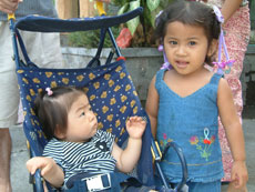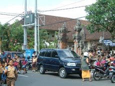 さらに行くと今度は小学生の集団に遭遇。学校の建物から出てくる出てくる...。小学生が横断する通りはすっかり麻痺してしまってました。私達も取り囲まれて身動きができなくなり,しばらくその場で小学生たちを観察。何やら箒らしき物を手にした子供がたくさんいます。バリの小学校ではマイ箒?を持参してお掃除でもするのでしょうか?道端の屋台に寄り道している子供達もいました。