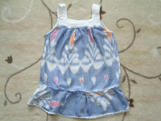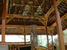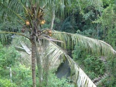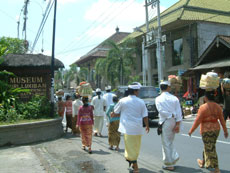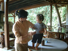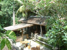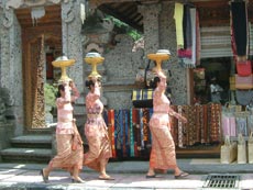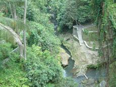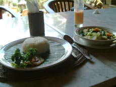 王宮を後にして,今度はラヤ・ウブド通りを西へ。少し早めのランチにしようと,川沿いの眺めの良さそうなレストランを目指して歩き始めました。 途中プリ・ルキサン美術館前で,頭の上に供物を載せて歩く人々と出会いました。格好も正装しているようなので,どこかで何かの儀式があるのでしょうか。それにしても頭に物を載せて上手にバランスをとって歩くよねえ。 少し歩いた所でかわいい子供服を売っているお店を発見。サイズが書いてないのでおじさんに一番小さいサイズのワンピースが欲しいというと,きれいに畳んで積んである山を掘り返したくさん出してくれました。麻布のワンピースで肩紐がバリニットの物で,いろんな色のがあったのだけど,藤色のが気に入って買うことにしました。おじさんは緑のがお勧めだったみたいだけど。お値段は交渉の末,Rp37000(←絶対高い!)。なかなか値切っても落としてくれなくて手強い相手でした。 チャンプアン川に向かって道は急な下り坂になっていて,結構距離はあるし帰りは絶対歩いては無理だなあと思いながら歩いていました。EIKIはアユン川を眺められる所まで行きたかったようだけど,チャンプアン川の所でいったん谷になっているので,その先はまた登り。地図を見るとさらに1キロくらいはありそうだったので,チャンプアン橋の傍に建つ「ブリッジ・カフェ」でランチにすることにしました。