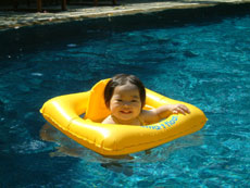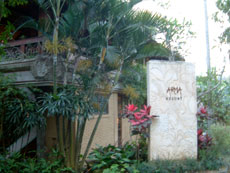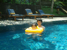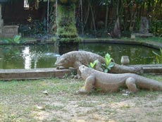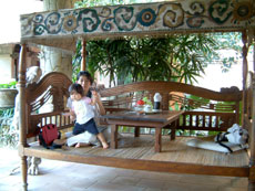 EIKIとHIYOもプールから上がって着替えた後は,チェックインの時にもらったお食事券を持ってアルマ内にあるWarung Kopiへ。美術館の裏手にあり,周りには田んぼがあってとても静かな所です。 ところでこのお食事券,普通に食事が出来るのだと思ったら,指定された中から1品選べるだけのものでした(^_^;A そして指定されたお料理と言うのが,メインになるようなナシゴレンとかではなく,居酒屋の一品料理?みたいなのばかり。 まあ,まだ夕食には随分早い時間だから,ちょっとした腹ごなしにと春巻きを頼みました。それだけでは寂しいのでドリンクを頼んだけど,その分は自費。 その後はアルマ美術館に入ることにしました。宿泊者は無料と言うことだけど,どこにもチケットをチェックする人がいなかったので,誰でも無料では入れてしまうのでは? この美術館は「アグン・ライ美術館」と言って,アルマリゾートの経営者,アグン・ライ氏がコレクションをしたバリ絵画が多く展示されています。その広さ4500u!常設展示棟と特別展示棟に分かれていて,灰色の黒炭で描かれたバリの伝統的絵画から,色鮮やかなヤングアーティストの作品まで楽しめます。 特に伝統的絵画は宗教的な題材のものが多く,絵が緻密で色合いが暗く,あまりの作品の多さにちょっと胸焼けがするかんじでした(笑)。館内は写真撮影禁止のため写真はありませんが,こんな感じの作品が展示されていました。