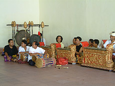 そのうち,どこからかバリ舞踊で演奏されるガムランの音が聞こえてきました。音楽を鳴らしているのではなく,実際にどこかで演奏している様子。私はとても気になって,水着姿で音源を求めて歩き出しました。 プールから小道を登っていくと,アルマ美術館の建物が見えました。そしてその中から音楽は聞こえてくるようです。同じアルマリゾートの敷地内とはいえ,この美術館には外からも観光客がやってくるので,さすがに水着姿でうろつくのはまずいと思い,一度引き返しました。EIKIとHIYOはまだしばらくプールで遊ぶと言うので,私だけ部屋に戻って服を着替え美術館の方に向かいました。 美術館の建物1階の広いスペースに,楽器を手にした人たちが座って演奏をしていました。何なのかなと思って見ていたら,時々声を出して音楽を止め話をしています。どうやらショーの音楽部隊が練習をしている様子。 建物の入り口の方に周って受付の人に聞いてみると,今日アルマで催される子供達のダンスの音楽を練習しているとのことでした。そのチケットを買わないかと言われたのだけど,今日は王宮のレゴンダンスを見に行くので...と断りました。 ガムランとは,インドネシアの打楽器合奏の総称なのですが,青銅の鍵盤と竹の共鳴筒でできた鉄琴のガンサ,クンダンと呼ばれる太鼓,ゴングがありました。反復の多い音楽で,ガンサの高い音が印象的でした。
