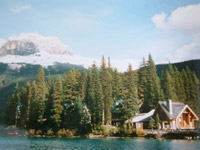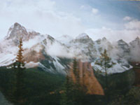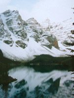 バスの窓から高く連なる山並みが見えてきた。テン・ピークスだ。次に訪れたのはこのテン・ピークスの麓にあり,コバルト・ブルーが美しいモレイン・レイク。 |