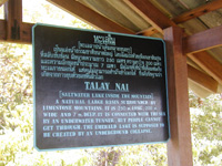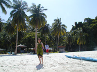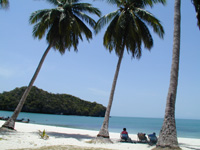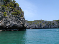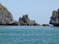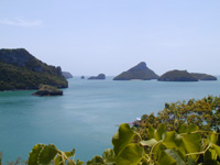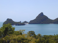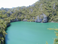 湖へは結構きつい岩場の階段を上っていきます。しばらく行くと緑色の湖が見えてきて 道が湖側とさらに上の展望台へと分かれていましたが,展望台に上がってみることにしました。展望台はアントンの島々が見える絶景。まるでいざなみといざなぎの日本列島創成みたいに,矛で海をかき混ぜて,その先からポタポタ落ちたのが島になったみたい。 振り返るとエメラルドグリーンの静かな湖面のタレイ・ナイ湖がありました。ここは真水ではなく,海とつながっているので海水の塩湖。結構魚もいるそうです。 滑りそうな階段を下り,ボートに戻ると,しばらくしてまたボートは違う島へ向け出発しました。着いた所は国立公園の中心地(?)みたいなところで,管理事務所や宿泊施設がありました。 そしてここでランチタ〜イム。クルーがボートに積んであったお料理を運び出して,あっという間にランチの準備は完了。みんな並んでお皿に料理を取って行きます。 みんなその辺に座っていたのですが,太陽にまともに当たっては暑くてしょうがないので,大きな椰子の木の木陰に場所を取り座りました。近くにビーチチェアを貸し出している所があって1つ10バーツだったのでEIKIが借りに行ってくれました。でも,なかなか帰ってこないのでどうしたのかと思ったら,100バーツでおつりがない様子。でもって,おつりがないからと言って手元にあった60バーツしかくれない。そんな馬鹿な話があるかと文句を言ったら,他の人にお金を貸してもらっておつりを渡してくれました。商売する気あるんかなぁ?しかもよく見てるとこのチェアー,誰かが使ってた後,お店に返さずに放置してあるのをそのまま使ったらお金を請求されてない。いい加減なもんだ...。 お昼を食べてしばらくすると,カヤッキングを申し込んだ人たちはカヤックに乗って近くに見える島に向け去って行きました。ほとんどの人が申し込んでいたのか,残っているのは数名だけ。私たちはのんびりお昼寝状態でした。カヤックも太陽が照り付けて暑いしねえとか言って,これならホテルのビーチで寝てても変わんないんだけど(^_^;)。 そのまま熟睡しそうになったので,ちょっとシュノーケルをつけて海に入ってみました。砂浜なのでちょっと濁ってるけど,結構魚がいました。でも,シュノーケルが顔にあってなかったのか,横から水がちょっとずつ入ってきて,長く泳いでられませんでした。ボートに交換しに行くのも面倒になって適当に遊んでました。 カヤックの人たちが島を1周し,洞窟みたいなのを見て帰ってきたら,アントン諸島の旅は終わり。サムイ島に向けてボートは出発しました。帰りはまたまた熟睡。かなり早く着いて3時45分くらいには戻ってきました。