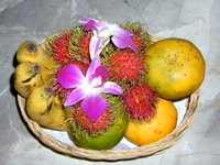 リビングルームにはトロピカルフルーツとタイの国花である蘭の花を置いてくれていました。フルーツは食べて減ったら補充してくれます。それからベッドサイドには毎日チョコレートを置いてくれてました(クーラーがついてないと溶けてしまうのが難点です)。リビングにはテレビもあって,サムイ島のプロモーションビデオが置いてあったけど,ビデオは映らなかった...(T_T)。テレビはタイ語でよく分からないし。