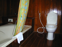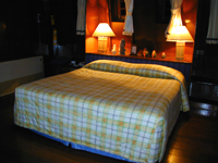 ベッドルームにはダブルベッドがあって,この部屋だけでも十分の広さがあります。冷房完備。到着したのが夜遅かったので,部屋は寒いくらいに冷えていました。部屋の奥にはバスルームがあり,洗面台には無料の飲料水が2本置いてありました。象さんの絵の書いてある瓶のミネラルウォーターで,毎日2本置いてくれるのがうれしいです。