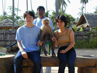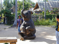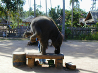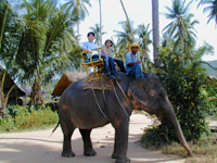 ◆象さんトレッキング◆ サムイ島内のビーチ以外のアトラクションといえば象さんトレッキング! いくつかのトレッキングをやっている所があって,滝に行ったり山に登ったりポイントが違いますが,私達が行ったのはチャウエンから環状線沿いに中に入ったISLAND SAFARIという所のツアーで,1時間コースで1000バーツ。象さんに乗って山を登り,その後象と猿のショーを見るものです。申込みはホテルからはもちろん,結構いろんな所にパンフが置いてあって,どこからでも参加することができそうです。 象使いが頭に乗って,私達は背中の椅子に乗ります。象が歩き出すと結構揺れます。象使いは鼻歌歌って,象さんは時々山のほうへ入って行って椰子の実を食べたりして寄り道をするので,なんだかとってものんびりした象の散歩をしているような感じです。椰子の実は,体重をかけて踏み潰した後,白い部分を器用に鼻でむしり取って食べていました。 象さんショーは小象の芸がとってもキュート。立ち上がったり,逆立ちしたり,座ったり。オレンジ色にして薬屋さんの看板象にしたい感じです(笑)。象のマッサージなんて寝転んだ人に軽く足を乗せてトントンする芸もありました。最後には全員に象の鼻キッス。 お猿の芸はいろいろな方法で椰子の実を取るもの。実際高い椰子の木に登って,椰子の実取りをお手伝いしてるんですね。 |