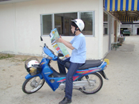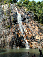 ![]() | ◆ナムアン滝◆ ナムアン滝は高さ18mの第T滝と80mの第2滝からなります。第Tの滝へは環状線のナムアン滝と書いてあるゲートをくぐってダートコースをくぐっていきます。途中第U滝への入り口があるのですが,山を登っていく道で看板には行きが30分,帰りが15分と書いてありました。看板の向かいの店からおじさんが出てきて「Free guide.」とか言ってたけど,時間がなかったので断りました。ほんとにフリーなのかな? どうも第U滝へは歩いてしかいけないと言われているけど,別の道から車で行けるようです。地図にも道が書いてあったし。 もう少し進むと第T滝の入り口の駐車場があって,バイク5バーツ,車は10バーツ取られます。ここから行く象さんトレッキングもあります。 滝はそんなにすごいといった感じではないけれど,泳いでいる人もいました。でも水がきれいじゃないし,泳ぐんだったらビーチのほうがいいと思うけど...。象さんが滝の横のすごい険しい道を歩いているのにびっくりしました。 | |