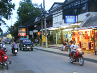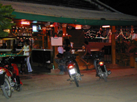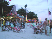 ◆チャウエン◆ チャウエンのメイン通り沿いには,銀行,両替所はもちろん,アクセサリーやパレオやタイコットンのワンピースの店,タイ雑貨の店,レストラン,インターネットカフェ,オープンバー,マッサージ店,スーパーなど何でもそろっています。ただ,お買い物をするには他より値段は高め。両替所は空港やチョンモンより率がよかったです。 ビーチは島の東側の4kmを占め,大型ホテルの建ち並ぶ賑やかな所。ここも遠浅で沖にはリーフが顔をのぞかせています。ビーチにいるとパレオやハンモック,アイスや焼きとうもろこし売りの人達がウロウロしています。 夕方頃になるとビーチ沿いのお店の人達は,ビーチチェアを片付け,テーブルをセッティングし始めます。ビーチ沿いにイルミネーションが灯り,夜もいっそう賑やかになります。 チャウエンのメインストリートから少し中に入れば,怪しげなピンク色のネオンが灯るお店がズラリ。レゲエ,ロック,ポップスなどガンガン音楽が鳴っているオープンバーやオカマバーなど何しろ夜も暑いチャウエンの姿が見られます。 早い時間に行ってみたら全然お客がいなくて怪しげだったので,中には入らずに帰ってきてしまいました(;^_^A |