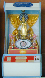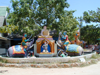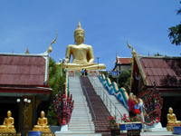 ![]() | ◆ビッグブッダ◆ 島の北側の海岸部に突き出した小さな島にある高さ12mのビッグブッダ。メイン道路からは小さな門をくぐって舗装されていない道を少し行きます。ビックブッダは小高い丘の頂上にあるので,ボプット港に帰ってくるスピードボートからも見え,またサムイ空港から飛行機が飛ぶ時にはビッグブッダに向かって飛び立つ形になっていて,サムイ島の目印的存在です。 ビッグブッダの階段下では仏像が売られていたりするんですが,その中でもびっくりしたのが*これ*。仏像の頭の周りの輪に電飾がくるくる回って,よく見るとスロットがあります。「パチンコの神様」と私は言ってたのですが,帰ってきて調べてみるとおみくじマシーンだそうです。なんかありがたみないよね(^_^;)。 | |