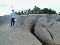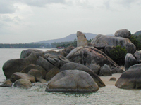 | ◆HIN TA&HIN YAI◆ ラマイビーチの南にあるおじいさん岩,おばあさん岩と呼ばれる奇岩。長い年月をかけて風の侵食でできた男性の秘部に似たHIN TAと波の侵食でできた女性の秘部に似たHIN YAI。なんでおじいさんとおばあさんなのか不思議だったのですが,老夫婦の乗った船が転覆し二人がこの海岸に打ち上げられ,この岩に姿を変えたという伝説があるそうです。 周辺にはちょっとしたお土産やさんや焼き鳥や串焼きの屋台があります。 | ![]() | ![]() |