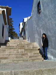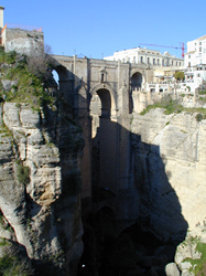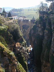 ヌエボ橋を渡り,グアダレビン川沿いに旧市街側の石畳の坂道を下っていく。しばらく行くとサルバティエラ宮殿があり,その前にローマ橋が架かっていて新市街側と結んでいる。新市街と旧市街とを結ぶ橋はヌエボ橋,ローマ橋,アラブ橋の3つだ。 今度はローマ橋を渡り,新市街側の白い家の間の階段,坂道を上って行く。所々谷に張り出したテラスがありとても眺めがいい。それにしても,よくこんな所に家を建てたものだなあと思う。