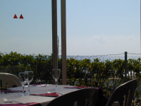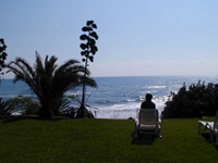 カフェの前に広がる芝生と 青い地中海 |