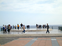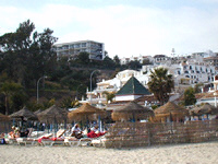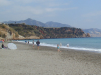 「ヨーロッパのバルコニー」がネルハの町のどのあたりにあるかわからないので,適当に海に向かって走ってみる。ちょうど出たところはブリアナ海岸のビーチになっていて,道沿いに駐車スペースがあり,多くの海の店が出ていた。まだ2月だというのに,多くの人でにぎわっていてみんな半袖姿,小さな子供は水着姿でまるで夏に季節が進んだみたいだ。大人たちはやしの葉っぱで作られたビーチパラソルの下に寝そべっているが,子供の中には海に入っている者もいた。