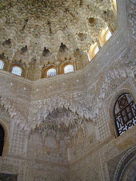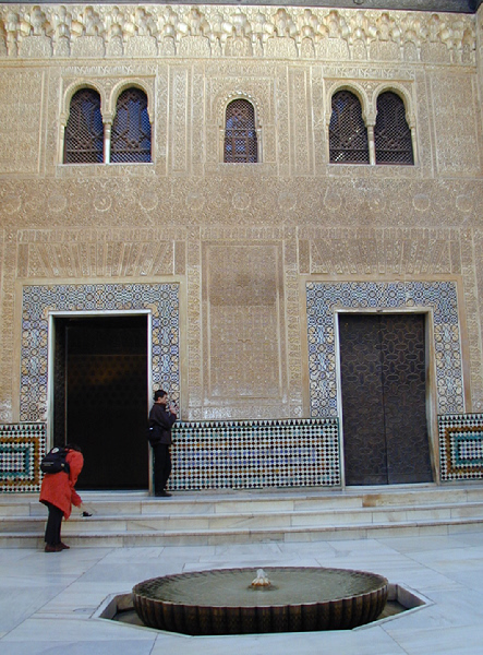 王宮に入ると,セビリアのアルカサルで見たようなレースのような細かい装飾とタイル模様が目に入ってきた。特にライオンのパティオを挟んで向かいにある二姉妹の間とアベンセラッヘスの間の鍾乳石飾りには驚いた。蜂の巣のようにも見え,ある意味グロテスクでもあった。