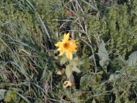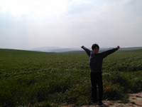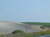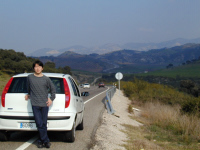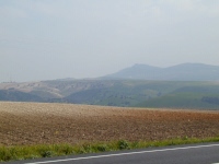 今度は成功。A376は昨日の高速道路と違い一般道。道は悪くないが遅い車がいると繋がるし,工事をしていて止められたりした。昨日はビュンビュン走ってじっくり見れなかった外の景色を眺めながらのドライブだ。周りには,殺風景で広大な大地が広がっている。赤茶けた土地は整地されていて,これから何か作物を植えるような感じだった。ちょっと乾燥して見える土地の所にはこじんまりしたオリーブの木が生えていた。所々緑色にきれいに草が生えているところがある。遠目に牧草地かと思っていたが,車を下りて見てみると小麦のようだった。(見た時はお米だーと言っていたが,水がなかったし,スペインは小麦文化圏だろう。パエリアはあるけど...)そして緑色の中に時々小さな黄色い花が見える。それは季節はずれで咲いている小さなひまわりだった。もしかしたら夏になるとここはひまわり畑になるのかもしれない。