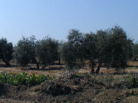 乾燥した大地に整然と植えられている 低木のオリーブ |