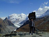 ツェルマットの駅前通,バーンホーフ通りはにぎやかでたくさんのお土産屋さんもあります。そこをどんどんまっすぐ歩いてシュルーマッテン・ゴンドラリフト乗り場へ。フーリでロープ・ウェイに乗り継ぎシュバルツゼーに向かいました。面白かったのが,ロープ・ウェイのおじさん。30分発のロープ・ウェイは満員になってもう乗れないのに全然出発しない。でも,針が動いて30分になった瞬間ベルがなって出発。時間に正確なのね。