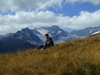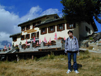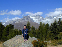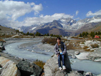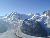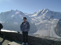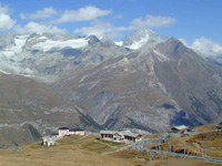 ゴルナーグラートからの眺めは,目の前にゴルナー氷河が広がり,その後ろにモンテ・ローザ,リスカムなどが手の届きそうな近さに見え,右手の少し遠くにマッターホルンが見える,360°のパノラマです。前日やはり雪が降ったらしく,展望台にはうっすら雪が残っていました。ハイジの「ヨーデフ」みたいな犬がいて,記念写真を撮っていました。その犬にカメラを向けたらすごい怒られました。商売道具なのね。