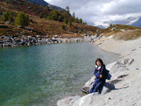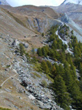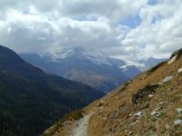 グリンジゼーを後にしコースを進むと,ちょっと危険な道。道は細く,横は谷。下のほうにモスジゼーが見えました。フィンデルン川と同じような不思議な色の湖です。スネガに近づくと,マッターホルンも近づいてきました。これは晴れていたら,ものすごい感動もの。本当に残念でたまりません。
