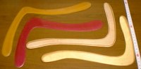 | Maximum Time Aloft 競技 略称(MTA) 投げ上げ巨大竹とんぼみたいなブーメランを使った、滞空時間競技です。 調子がいいと1分近くホバーリングをします。 ただし、100mの円の中で投げて、円の中で取る。ここがミソです。 風の読みとブーメランの作りこみが、勝敗を分けます。 競技を始めた頃は一番の得意種目だったんですけどね...。 最近、チューニングとフォームがお馬鹿になっています。 ※下の写真はクリックしても大きく開きません。 また、右の白線はメジャーです。100mm毎に赤いマークがついています。 |