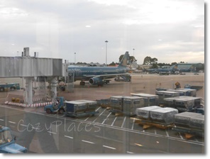 そんなこんなで、初ベトナム航空♪ 出発が遅くなった分、ほどよくおなかも減って、機内食はしっかり食べる。 機材も新しくて、気分良し。 彼用に映画をダウンロードしてたのでタブレットを渡し、自分は路線図?眺めて過ごす。 揺れはともかく、お天気は良かったのでぱちり。 前の席にいたおねいさんが吐いてた ・・・ かわいそうに、ここまでがまんしてたのね。 それよりなにより。 着陸したのが15時半近く、乗り継ぎ便は16時半予定。 本来なら3時間ほど余裕があったから、最後尾の座席でも関係ないしーと思てたけど、 沖にとめられ、ドアが開くのをじりじり待つのは心臓に悪い。( ̄◇ ̄;) と、後ろのドアも開く模様。!。 ちょっとほっとしつつ、タラップ降りてバスでターミナルへ。 初めての空港やのに、1時間ちょっとでなんとかなるのか?!(><) そしてなかなかスタンプ押してくれへんイミグレもなんとかやり過ごし、荷物受け取り場へ。