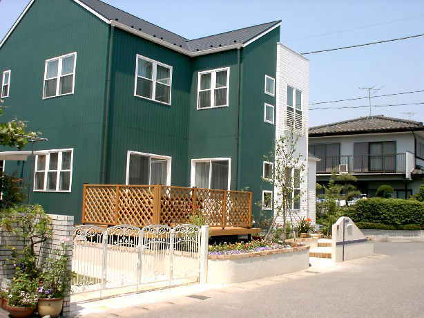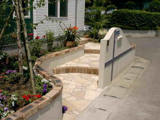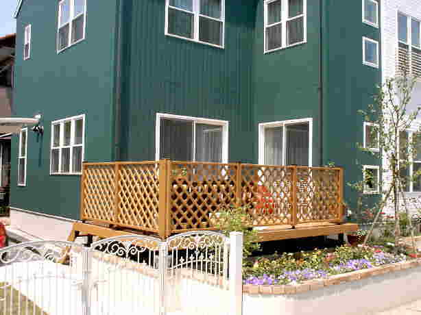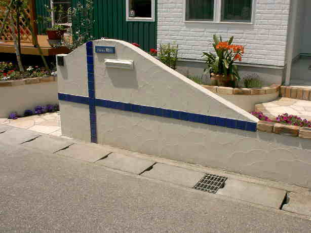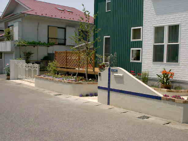 建物全景 シコク パレット塗り壁仕上げ アプローチまわり ドイツ石乱貼り 北欧国旗風タイル貼り INAX 新日軽 木樹脂デッキ 車庫まわり TOEXフェスタ4枚折戸 K様へのホームページはこちらから・・・ さらに詳しくごらんになれます。(^。^)