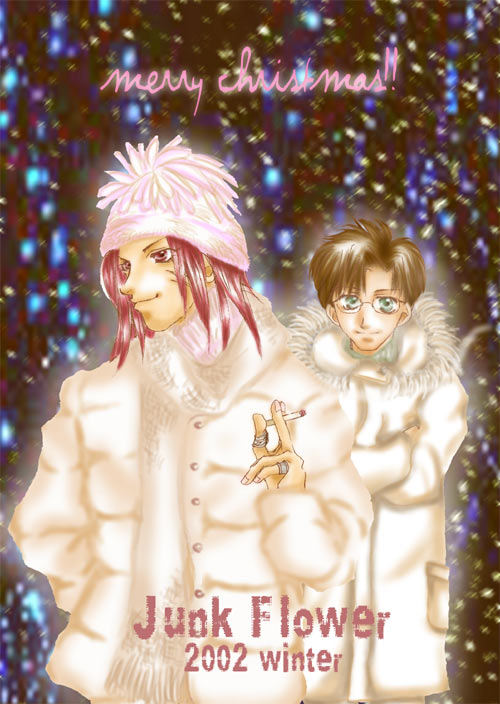 | 2003年1月新刊予定のAttraction Garden番外編表紙/裏イラストです〜。 実際の表紙はもっとシンプルなデザインになる…予定。 コレも天捲同様イラストらしく背景入れてみました。 で、季節柄クリスマス仕様に…え?デート!?念願のデート(笑)。 背景は写真をフォトショで加工しまくりでキラキラにしました。 元の写真はさいたま新都心のクリスマスイルミネーションなんですわい。 で、加工もアホほどやってます…でもやっぱり覚えてません。 何だか色塗ってたら、えらくラブリーなカップルに…でもハチは黒さが薄まってないような気が…悟浄、ケツには気を付けろ(笑)。 |