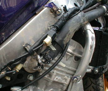 ![]() サーモスタッドのカバーが吹っ飛び、ホースクランプも破れております。 |