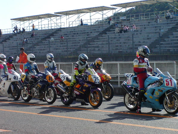 レース直前のJOE サイティングラップに入るNo.25さいさりす 51番の向こうに隠れる62番はモリワキのF4 F4iをおいかけるさいさりす このあとメインストレートで抜きます。