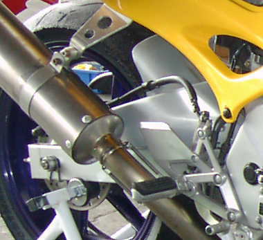 レーサー化と共にサイレンサーステーも軽量なアルミ製の物に変更しました(ヨシムラ)