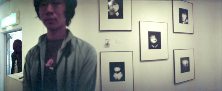 こっちはもっと寄り過ぎました〜更に反省 ファインダー内はもっと上まで入ってたのに・・・ でもかえって、彼の顔がよく見ないってことが 彼の作品のアンダーグラウンドなイメージと重なって 更にドアの所にいる女性も謎めいていて この写真かなり気に入ってます 偶然の産物だけど <<< thumbnails >>>